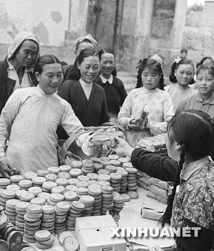 這是1963年中秋節,山西省運城縣大渠公社寺北村大隊的社員在購買本村供銷點供應的月餅(資料照片)。 新華社發