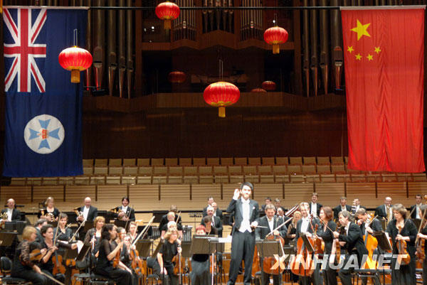 9月2日,在澳大利亞東部海濱城市布里斯班的昆士蘭州表演藝術(shù)中心音樂大廳,來自中國香港愛樂樂團(tuán)的副指揮蘇柏軒與昆士蘭交響樂團(tuán)演出后向觀眾致謝。當(dāng)日,為慶祝中華人民共和國成立60周年和中國傳統(tǒng)佳節(jié)中秋節(jié),以及昆士蘭建州150周年,由昆士蘭交響樂團(tuán)和來自中國的年輕藝術(shù)家們在這里聯(lián)袂演出一場題為“東西合璧”的音樂會(huì)。 新華社記者江亞平攝
