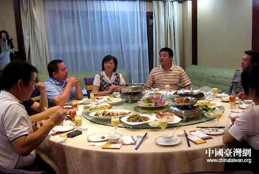 鄖縣臺辦主任胡德鮮特從鄖縣帶來該縣湖北梨花村酒業集團釀造的“木瓜”紅酒、“梨花情”白酒與臺商們開懷暢飲。