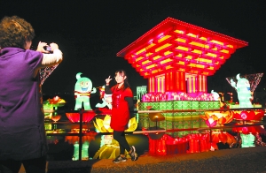 按照世博中國館等比例縮小后制成的“彩燈世博中國館”,旁邊還圍繞著5個(gè)形態(tài)各異的海寶;衣帶飄飄的嫦娥忽悠忽悠地飛向月宮;兩條閃閃發(fā)亮的巨龍橫亙在龍?zhí)逗妗浾邚凝執(zhí)豆珗@了解到,這次燈會(huì)特別聘請了來自四川自貢的專業(yè)花燈制作人員。根據(jù)龍?zhí)豆珗@中心點(diǎn)綴湖水,四周綠樹環(huán)繞的空間布局,整個(gè)公園里一共設(shè)置了60組不同規(guī)模的燈組。其中水上大型燈組有36組,而陸地?zé)艚M則有24組,內(nèi)容包括“魅力東城、錦繡新區(qū)”,“歡樂世博”,“龍鳳呈祥”,“月圓中秋”等各式喜慶的觀賞燈組。