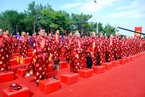 3名分別來自廈門、臺灣、東南亞的主祭人帶領(lǐng)著250名同祭人參加了以“感恩土地孕育萬物,祈盼兩岸福澤綿長”為主題的盛大祈福頌典儀式。3名主祭人向福德正神敬獻了香、鮮花、牲果、酒、祝文。250名同祭人跟隨著3名主祭人行叩拜之禮。