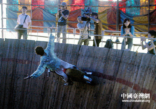 中國臺(tái)灣網(wǎng)8月17日沈陽消息 高速飛馳的機(jī)車,陡峭如立的絕壁,以及各種高難的特技動(dòng)作,很難想像這三者竟能完美合一。日前,臺(tái)灣中時(shí)傳媒采訪團(tuán)便在沈陽欣賞到了這難以置信的人間絕技——“飛車走壁”。