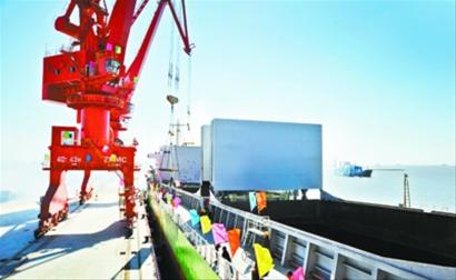 今年以來,盤錦市大力推進榮興港、疏港鐵路建設,并啟動沈盤鐵路建設。目前,榮興港一期工程實現通航,圍繞港口建設的疏港鐵路將在2011年底全線貫通。圖為貨輪在榮興港萬噸級泊位裝載貨物。(萬重 攝)