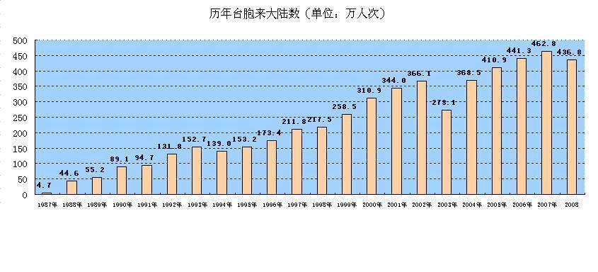 臺灣人民赴大陸地區,不論是人數或是比例,都遠高于大陸地區人民來臺。依據海峽兩岸基金會的研究結果顯示,臺灣地區學生前往大陸地區人數明顯高于大陸地區學生來臺人數(張璞先,2007)。大陸自舉辦第一屆臺胞青年夏令營開始,每年均持續舉辦類似活動,辦理規模年年擴大,以落地接待的方式邀請臺灣學生赴大陸參加夏冬令營活動(例如:2004年“全國臺聯”督辦的夏令營,全大陸共有十九個省市區舉辦,參加者共1,200余名,其中558人來自臺灣、在大陸就讀的臺生343人、大陸臺籍大學生202人,還有部分臺商子女)。由此可知,兩岸學生交流,大陸地區舉辦活動較臺灣地區頻繁(劉勝驥,2007)。