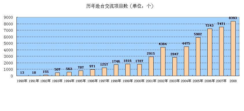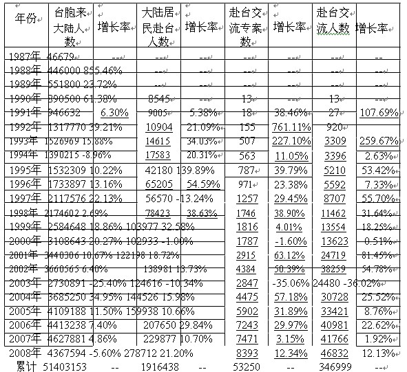 臺灣自一九八七年開放大陸探親后,即頒發兩岸地區教育交流的若干規定,而大陸教育部“教育委員會”也有相關規定負責管理大陸人士來臺教育參訪,并協助臺灣人士赴大陸的學校、教育機構學習、進修、講學、研究,及與大陸進行教育交流、合作等相關事宜。近年來,兩岸文教活動交流活動頻繁,人數屢創新高。依據統計數據顯示,大陸地區人士來臺從事文教活動由2005年的12,315人、2006年14,775、2007年16,226到2008年的20,546(大陸工作委員會,2009)。依照此一趨勢看來,兩岸交流活動日益趨多,有增無減。