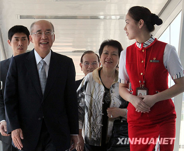 7月10日,中國國民黨主席吳伯雄率團抵達長沙,出席即將于7月11日至12日在長沙舉行的第五屆兩岸經貿文化論壇。新華社記者 邢廣利攝