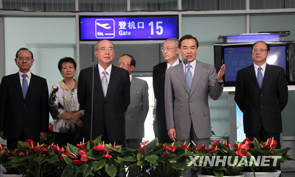 7月10日,中共中央臺辦主任王毅(前右)在機場講話。新華社記者 邢廣利攝
