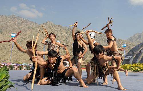 6月27日,演員在開幕式上表演舞蹈《遠古的呼喚》。當日,第三屆賀蘭山巖畫藝術節暨國際巖畫學術研討會在寧夏賀蘭山腳下開幕;顒右浴肮艓r畫與新時尚”為主題,舉辦巖畫藝術品展、賀蘭山巖畫修學、科考文化探秘攝影等系列活動。新華社記者 王鵬 攝