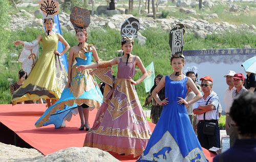 6月27日,模特在開幕式上展示巖畫主題服裝。當日,第三屆賀蘭山巖畫藝術節暨國際巖畫學術研討會在寧夏賀蘭山腳下開幕;顒右浴肮艓r畫與新時尚”為主題,舉辦巖畫藝術品展、賀蘭山巖畫修學、科考文化探秘攝影等系列活動。新華社記者 王鵬 攝