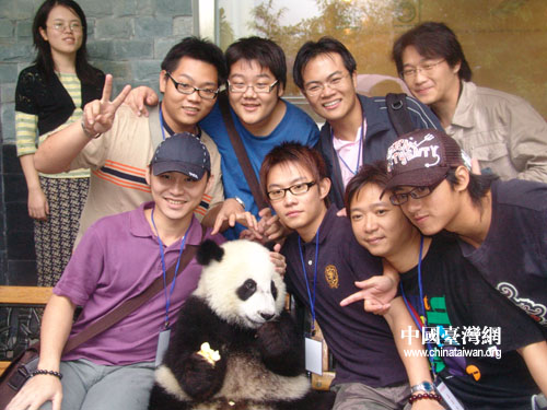 開幕式結束后,團員們參觀了臥龍大熊貓保護研究中心。雖然整個參觀活動都在綿綿秋雨中進行,臺灣朋友們仍然熱情不減,看到一只只嬌憨可愛的大熊貓或怡然自得的獨自嬉戲、或三兩成群的玩耍打鬧,大家不時發出興奮的歡呼,并爭相與大熊貓合影。當來到贈臺大熊貓“團團”、“圓圓”的棲息地時,團員們無不駐足;而“團團”、“圓圓”也似乎知道有朋自臺灣來,表現的格外熱情活潑,給大家進行了一場生動的熊貓生活秀表演。臺灣學生們情不自禁的發出“‘團團’、‘圓圓’我們愛你”的喊聲,他們表示,希望“團團”、“圓圓”早日赴臺,能讓自己在臺灣的親人和朋友也早日看到這對可愛的熊貓。