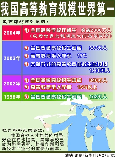 對于人口眾多、地區經濟、文化發展極不平衡的中國來講,教育總體水平還是比較落后的。小學、初中和高中畢業生升入高一級學校的比例是教育發展水平的重要指標。據1995年全國百分之一人口抽樣調查資料,每10萬人口接受過各種教育的人口分別為:大專以上的2,065人;高中的8,282人;初中的27,283人。中國的教育事業要滿足國家經濟和社會發展的要求,要滿足青年人接受高中階段和大學階段教育的愿望,還有很長的路要走。