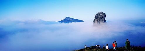 梵凈山坐落貴州銅仁地區的江口、印江、松桃三縣結合部,海拔不是太高(相對西部山峰而言),為2572米,是武陵山脈的主峰,也是貴州的第一高山。山峰上有兩個金頂,北面的為老金頂,南面的為新金頂(后人為了便于稱謂山上兩個主峰,故此),本主題反映的是新金頂。