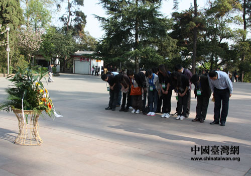網絡媒體記者向烈士紀念碑敬獻花籃(中國臺灣網 李丹 攝)