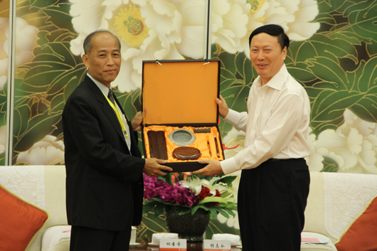 臺灣團團長與山東省的領導互贈禮物。(中國臺灣網 芮益芳 攝)