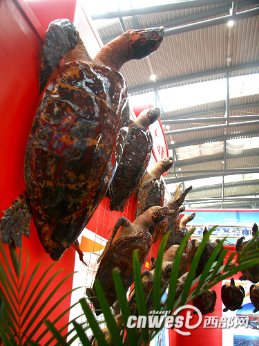 西部網訊 在遼寧省的一個展位,大大小小近40只“海龜”、“玳瑁”和“小鱷魚”爬滿了墻壁和展臺。