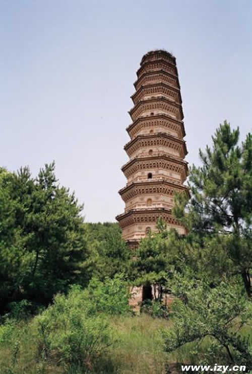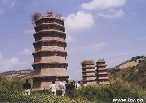 位于富縣城西北500米左右的西山坡上。塔身為磚結構,面向正東。平面呈四邊四角,每邊長8米多,直徑8.5米,塔高32.8米,分為十層。塔內有方形小室直通頂層,原筑有木梯可以攀登。塔外每層均辟有門,第四層東門兩側還飾有窗戶。第一、二層轉角及補間兩處均飾一朵斗拱,為把頭絞項(即一斗三升)、第二層大斗斗口出要頭,作批竹昂狀。第三層飾一大斗也作批竹昂狀要頭。第四、五層僅各飾一大斗,上承檐枋。第六層以上無斗。據此推斷,富縣塔為唐代建筑。塔下臺地上有清代《重修準提庵碑記》一塊,上書,在此“俯視山水,豁然在目。嘯風吟風,披襟選勝......”。這里是欣賞山水風景的好地方。 |