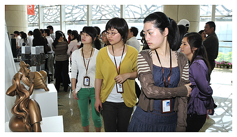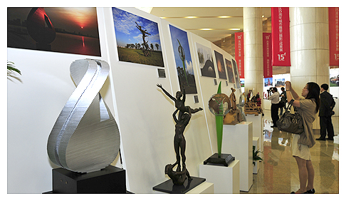 金雞湖畔的“圓融”、獨(dú)墅湖高教區(qū)前的“升華”、湖濱大道上的輪滑者……一個(gè)個(gè)令市民熟悉的雕塑都被搬到了科文中心。5月8日,蘇州工業(yè)園區(qū)15周年城市雕塑(攝影)成果展在科文中心開展,68組112件雕塑作品被翻制成模型,配合著120幅優(yōu)秀攝影作品展示在市民的面前。蘇州市副市長朱建勝、園區(qū)工委副書記、管委會副主任施玉初出席了開展儀式。