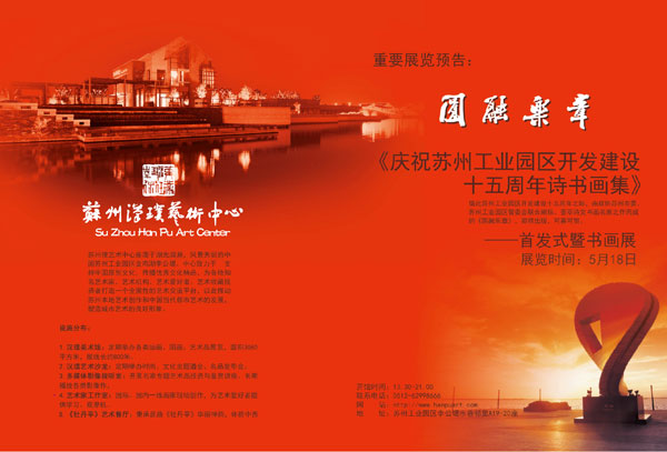 值此蘇州工業園區開發建設十五年之際,由政協蘇州市委、蘇州工業園區管委會聯合編輯、薈萃詩文書畫名家之作而成的“慶祝工業園區開發建設十五周年詩書畫集”——《圓融樂章》首發式暨書畫展將于5月18日在李公堤漢璞藝術中心舉辦。