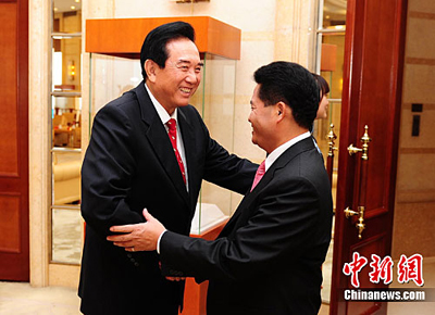 9月25日下午,海峽兩岸關(guān)系協(xié)會(huì)會(huì)長(zhǎng)陳云林(左)在北京會(huì)見了鄭銘坤先生率領(lǐng)的臺(tái)灣媽祖聯(lián)誼會(huì)訪問團(tuán)一行。中新社記者 侯宇 攝
