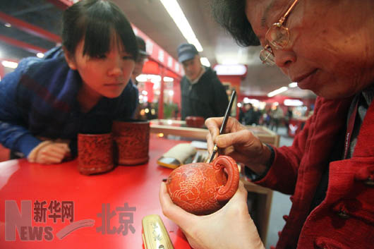 11月18日,參觀者在北京文博會(huì)上觀看藝人現(xiàn)場(chǎng)制作北京雕漆工藝品。