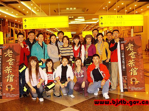 2007年1月2日至11日,由北京老舍茶館演出人員組成的,集京味文化、茶文化、戲曲文化于一身的第七屆“京味文化之旅”展演團,應臺灣中華中道學會邀請來到寶島臺灣,先后在云林縣虎尾鎮布袋戲主題館、臺中耕讀園、臺北縣坪林茶葉博物館、臺北縣淡水紅樓茶館、臺北紫藤廬茶藝館和鶯歌鎮活動中心進行了四場演出和兩場交流。老舍茶館獨具濃郁京味、京腔、京韻特色的展演,被譽為“茶與文化藝術的結合”,令島內民眾看得如醉如癡,場場爆滿,受到了大批觀眾的喜愛。很多臺灣觀眾看完演出后意猶未盡,紛紛表示要到北京來看一個“原汁原味的老舍茶館”。