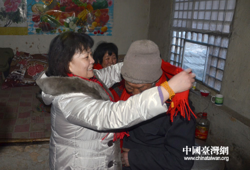1月5日,“北京臺灣城”28名員工在董事長郭瑞先帶領下來到阜平縣, 為駱駝灣村每家每戶送去過冬物資。圖為“北京臺灣城”董事長郭瑞先為村民帶上圍巾。(中國臺灣網發)