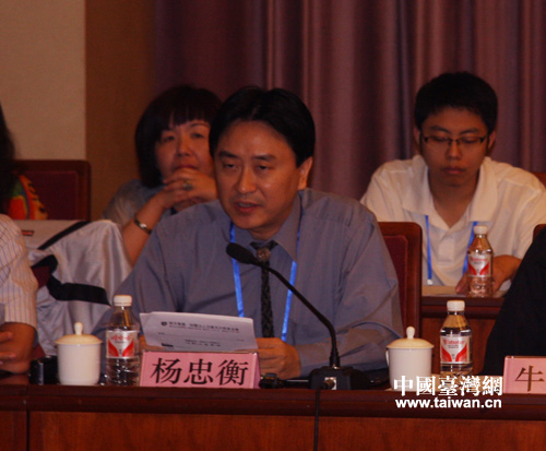 在7月9日上午舉行的“兩岸表演藝術傳承發展論壇”上,來自臺灣桃園縣廣藝基金會執行長楊忠衡就“兩岸表演藝術如何迎接市場挑戰”進行了演講。(中國臺灣網 蕪同 攝)
