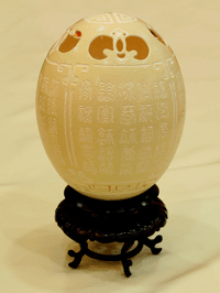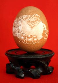 蛋雕是近年來逐漸興盛 起來的一種民間手工藝品。蛋雕工藝品有多種,一種是用雕刀在表面顏色較深的雞蛋殼上雕刻人物、山水、花鳥等圖案,圖案成形后其效果類似于美術中的素描或線條勾勒;另一種是選用質地較厚的鵝蛋、鴕鳥蛋等禽蛋作為材料,以淺浮雕或鏤空的手法進行雕刻。蛋雕作品完成后,還要進行清除蛋液、消毒等處理。由于禽蛋殼比較薄脆,在上面進行雕刻難度很大,因此目前蛋雕在市面上還不多見。