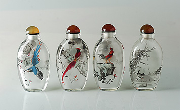 內(nèi)畫(huà)鼻煙壺是一種特制的玻璃器皿和水晶壺。壺有鴨蛋般大小,頸細(xì)口小,通體透明。內(nèi)畫(huà)藝人使用特制的彎頭小筆,用顏料在壺的內(nèi)壁上描繪出山水、花鳥(niǎo)、魚(yú)蟲(chóng)、人物等。由于壺瓶形狀美觀大方,內(nèi)壁畫(huà)十分精湛,因此成為藝術(shù)殿堂中一枝艷麗的花朵。