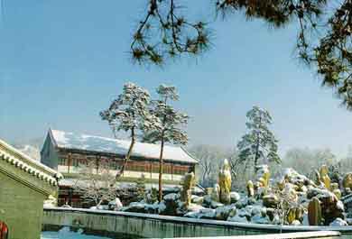 文津閣前有四組建筑,已毀,今存遺基。東為干尺雪,仿江蘇寒山千尺雪建造;千尺雪西一組名寧?kù)o齋,四周環(huán)繞回廊,院內(nèi)前齋后樓,中有池水分隔,康熙為樓題匾“清敞”,乾隆為齋題名“寧?kù)o”。寧?kù)o齋南一組建筑名曲水荷香,按王羲之《蘭亭序》描寫(xiě)建造,供皇帝和御用文人戲酒吟詩(shī)所用。再東又一組建筑為前亭后殿,乾隆題名玉琴軒(康熙曾題圖史自?shī)剩新?lián)“寓情最覺(jué)靜可樂(lè),無(wú)物始知閑不爭(zhēng)”。