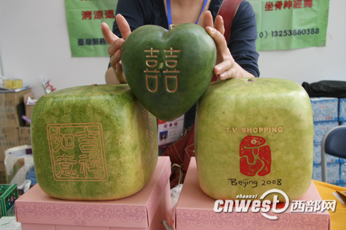 “這西瓜能長成方形,能不能長成三角形?”,有人問到。老板一笑:“能啊,我這有個心性的,看看”,說著從桌下掏出一個香瓜大小的心型西瓜。“這西瓜主要的作用是觀賞,可以放兩年不壞”。