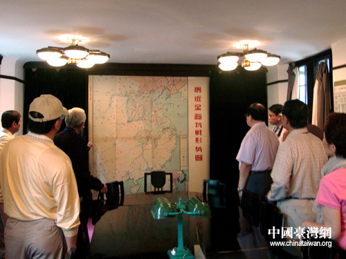 兩岸學(xué)者在抗戰(zhàn)時(shí)期蔣介石辦公地云岫樓“全面抗戰(zhàn)形勢(shì)圖”前駐足觀看