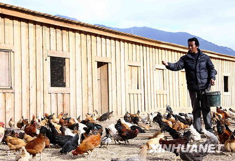 資料圖片:尼瑪在西藏米林縣一養(yǎng)殖場為飼養(yǎng)的藏雞喂食,他在當地政府支持下,從2007年開始飼養(yǎng)藏雞、藏豬,現年收入已達6萬元(1月11日攝)。新華社記者陳建力攝