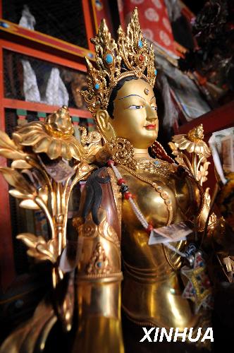 資料圖片:這是薩迦寺內重要文物之一——綠度母像(2008年11月28日攝)。國家投資8600萬元的西藏薩迦寺維修工程已經完成了近80%,預計2009年將完成全部維修任務。薩迦寺始建于1073年,是藏傳佛教薩迦派主寺。新華社記者覺果攝