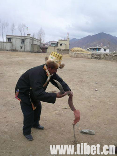 村民開始固定要用石頭擊打的牛角。 攝影:曲曉麗