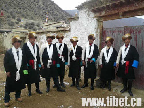 當每個人投擲三次之后,第一輪比賽就結束了。所有的人一陣歡呼,飛跑著來到牛角處撿拾自己心儀的石頭,準備繼續投入下一輪的戰斗。三輪比賽結束之后,四個村都有代表擊中牛角,這就預示著在新的一年中,所有的村落都會風調雨順,吉祥如意。村民們來到廣場邊,圍坐在一起,喝著青稞酒,聊著天,等候著一會兒將要進行的跳“鍋莊”活動。