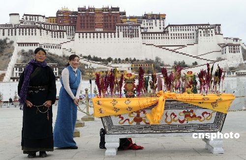 在二十三日的布達拉宮廣場,不時有市民、游客在切瑪前照相。據布達拉宮管理處負責人介紹,往年藏歷新年期間,多以鮮花裝點布達拉宮廣場,今年為突出民族特色,特地在廣場擺放了象征五谷豐登、來年身體康健的切瑪。