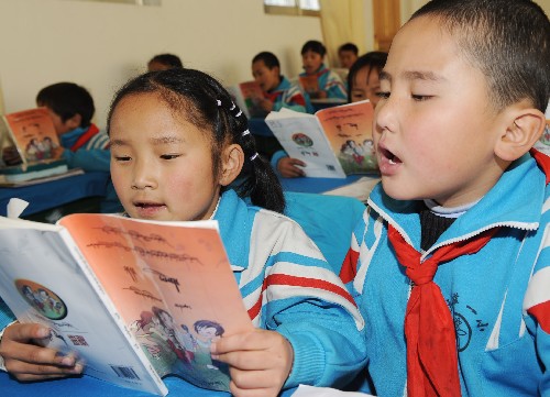 3月9日,拉薩第一小學學生格桑央吉(左)、扎拉玉杰在讀藏文課本。 新華社記者 索朗羅布 攝