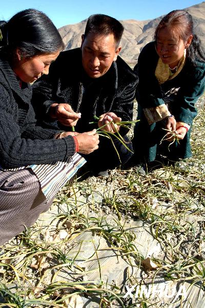 資料圖片:2006年12月5日,西藏乃東縣的兩位農(nóng)民在種藏蒜能手嘎多次仁(中)的指導(dǎo)下學(xué)習(xí)大蒜種植經(jīng)驗(yàn)。新華社記者 索朗羅布 攝