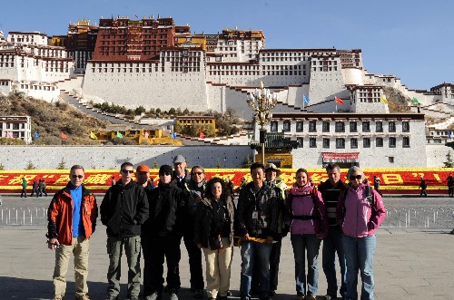 資料圖片:4月5日,德國旅行團一行在拉薩布達拉宮前合影。新華社記者 覺果 攝