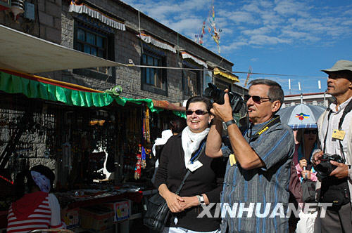 2008年6月27日,美國游客在拉薩老城區八廓街拍照。