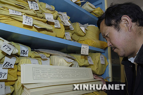 西藏社會科學院藏文古籍出版社的藏族學者次旦在整理古籍(2008年3月26日攝)。新華社記者 普布扎西攝
