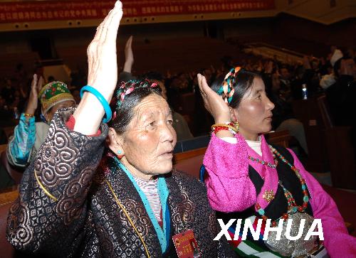 資料圖片:這是西藏人大代表在舉手表決通過政府工作報告(2008年1月22日攝)。新華社記者 索朗羅布 攝