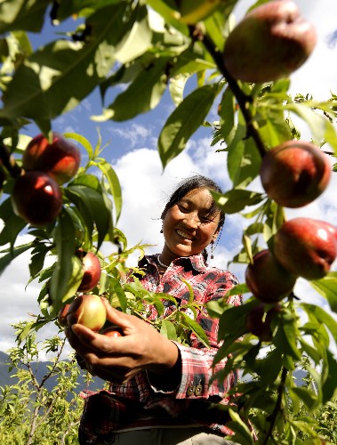 資料圖片:西藏林芝地區的一名藏族姑娘在采摘水果(2008年7月9日攝)。新華社記者 普布扎西 攝