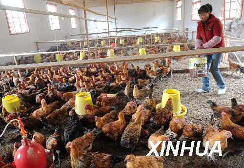資料圖片:西藏林芝地區林芝縣唐堆村養雞場的管理員周華英正在喂雞(2008年10月28日攝)。新華社記者 索朗羅布 攝