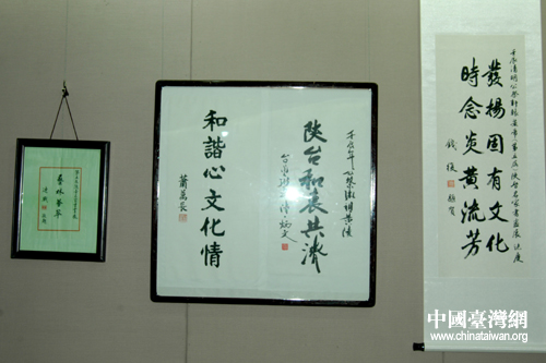 連戰(zhàn)、蕭萬長、錢復(fù)分別為本次書畫展題詞。(張群莉 攝)