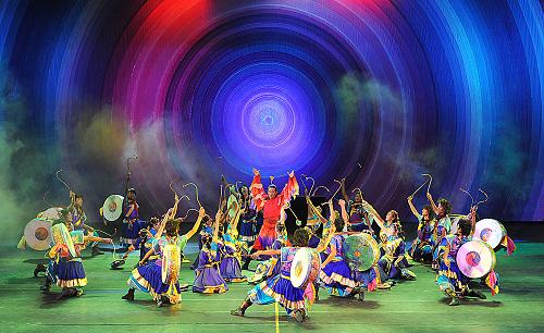 8月31日,演員在大型西藏原生態歌舞詩《幸福在路上》中表演“祈日鼓”。