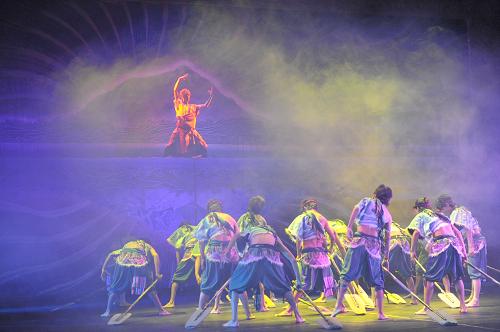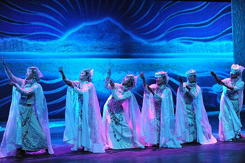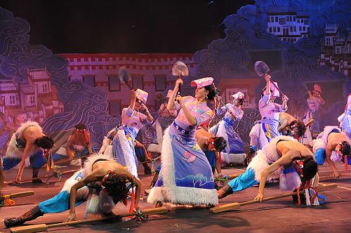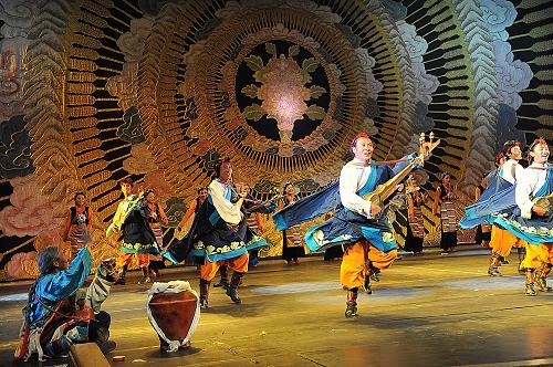 當日,由西藏珠穆朗瑪集團出品的大型西藏原生態歌舞詩《幸福在路上》在拉薩上演。該作品以多視角、多空間營造神奇、圣潔、質樸和熱忱的浪漫風格,展現西藏獨特、悠久而燦爛的傳統文化。新華社記者 魯鵬 攝