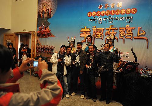 8月31日,觀眾在大型西藏原生態歌舞詩《幸福在路上》演出結束后與演員合影留念。新華社記者 魯鵬 攝