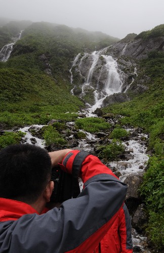 游客在墨脫縣境內的瀑布前拍照(7月9日攝)。 新華社記者 格桑達瓦 攝